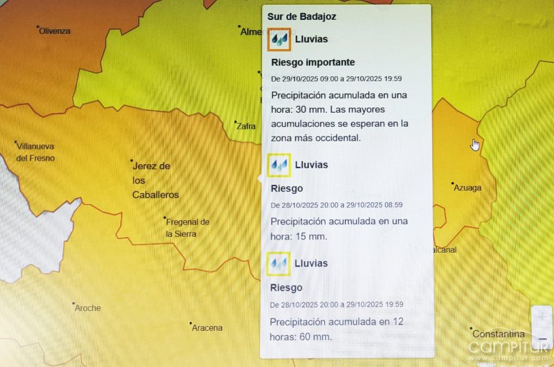 Según el aviso, se podrían registrar acumulaciones de hasta 15 litros por metro cuadrado en una hora y 40 litros en 12 horas, lo que podría afectar a municipios como Azuaga, Llerena, Fregenal de la Sierra, Jerez de los Caballeros o Villafranca de los Barros.