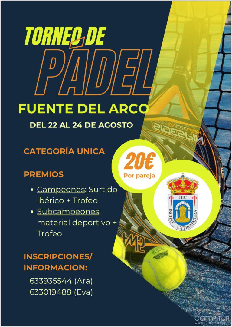 Del 22 al 24 de agosto, la localidad de Fuente del Arco acogerá su esperado Torneo de Pádel, una cita deportiva que reunirá a aficionados y jugadores en un ambiente de competición y convivencia. El campeonato se disputará en categoría única y tendrá un coste de 20 euros por pareja.